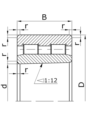 d - номинальный диаметр отверстия внутреннего кольца; D - номинальный диаметр наружный цилиндрической поверхности наружного кольца; B - номинальная ширина подшипника; r - номинальная координата монтажной фаски. |